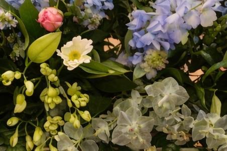 -Featuring soft blue, white and green seasonal flowers